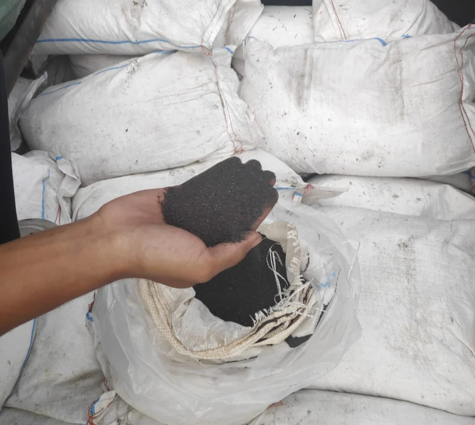 Caption: konsentrat pasir timah dari hasil penambangan yang dikemas dalam karung-karung untuk proses pengolahan lebih lanjut.(Sumber-net)