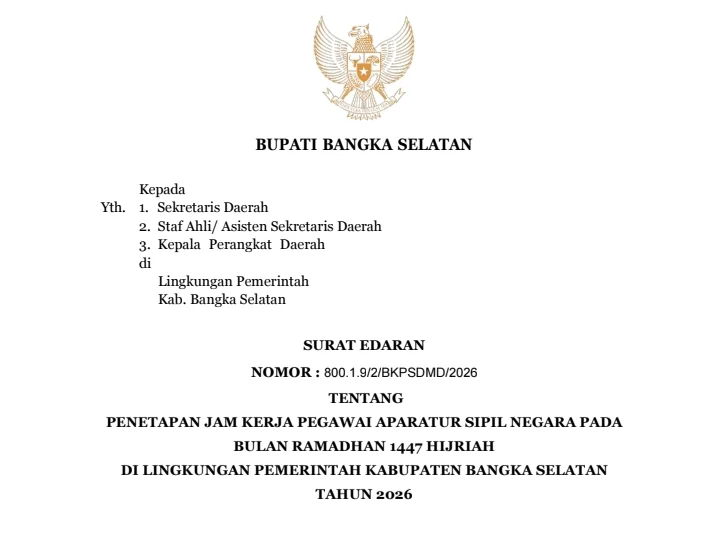 Kebijakan tersebut tertuang dalam Surat Edaran Bupati Bangka Selatan Nomor 800.1.9/2/BKPSDMD/2026 tentang Penetapan Jam Kerja ASN pada Bulan Ramadhan 1447 Hijriah di lingkungan Pemerintah Kabupaten Bangka Selatan.